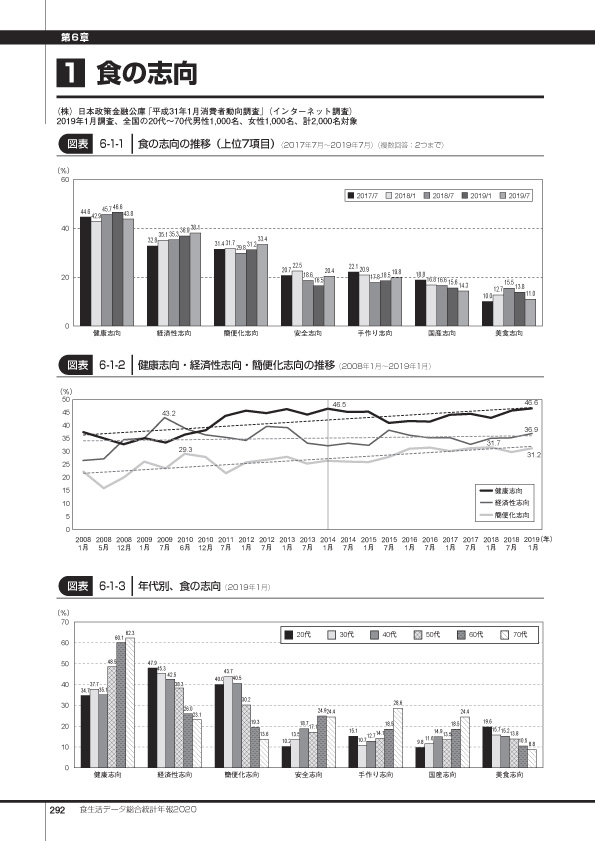 食の志向/ 昭和世代と平成世代の「食」習慣/ 完全食/ 一人暮らしの食生活/食料品アクセス問題/ フードロス/ 消費増税と食卓の変化/ 食品産業景況DI/培養肉/ ジビエ/ 日本のベジタリアン人口/ 介護レトルト食品/ 子ども食堂・フードバンク・フードドライブ/ 有機食品等の消費/ 自然災害による農林水産物の被害と対策/ 地球温暖化に対する農林水産業者意識 など